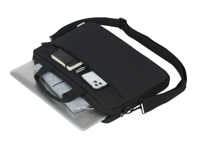 Dans le compartiment à fermeture éclair situé à l'avant, des accessoires mobiles comme votre smartphone, vos cartes de visite, vos stylos, etc. seront toujours à portée de main. La bandoulière réglable et amovible garantit un confort de transport agréable.