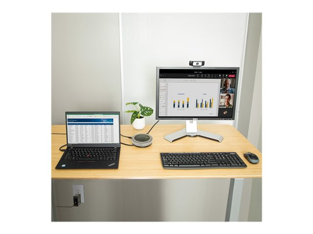 Ce mini-dock de conférence USB Type-C comprend une enceinte, une sortie vidéo HDMI/VGA, un port USB-C pour la passation de l'alimentation et des données, un concentrateur USB-A x2, un câble hôte USB-C intégré et des boutons tactiles avec des indicateurs LED. Il simplifie la configuration d'une station de travail en transformant n'importe quel bureau en espace de téléconférence. Le dock dispose d'une sortie vidéo unique HDMI ou VGA. Il possède 2 ports USB-A et un port USB-C avec possibilité de passation de l'alimentation (PD). Le dock de conférence se connecte à l'appareil hôte à l'aide d'un câble hôte USB-C intégré de 56 cm. Connectez ce câble hôte à un port USB-C ou Thunderbolt 3/4 .