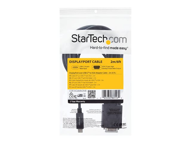 StarTech.com 6ft (2m) USB C to VGA Cable, 1920x1200/1080p USB Type C to VGA Video Active Adapter Cable, Thunderbolt 3 Compatible, Laptop to VGA Monitor/Projector, DP Alt Mode HBR2 Cable - 2m USB-C Video Cable (CDP2VGAMM2MB) - Câble vidéo / USB - 24 pin USB-C (M) pour HD-15 (VGA) (M) - 2 m - support 1920 x 1200 (WUXGA) - noir - pour P/N: TB4CDOCK CDP2VGAMM2MB