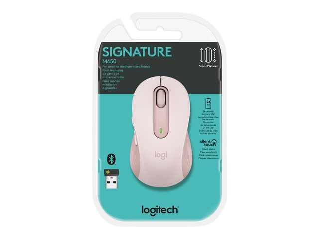 Logitech Signature M650 - Souris - optique - 5 boutons - sans fil - Bluetooth, 2.4 GHz - récepteur USB Logitech Logi Bolt - rose