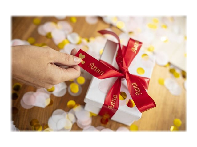 Lors d'occasions spéciales, utilisez le ruban TZe-RW54 avec votre étiqueteuse P-touch pour adresser vos vœux aux personnes qui vous sont chères.  Laissez libre cours à vos talents et personnalisez vos cadeaux, vos cartes et vos créations avec le ruban tissu TZe-RW54 Brother original.