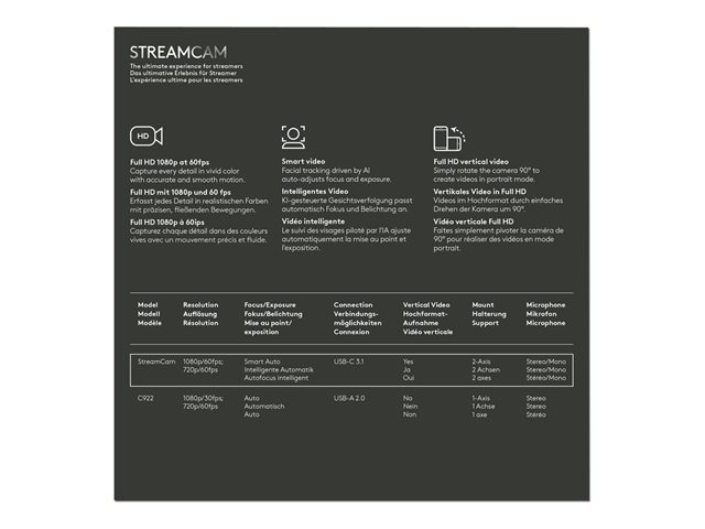 Logitech StreamCam - Caméra de diffusion en direct - couleur - 1920 x 1080 - 1080p - audio - USB-C 3.1 Gen 1 - MJPEG, YUY2