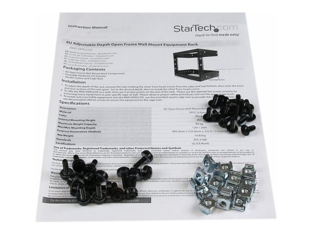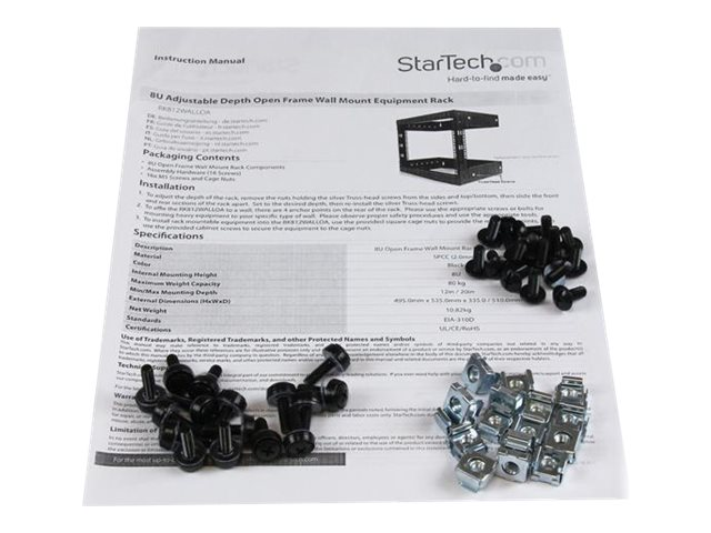 StarTech.com 8U 19" Wall Mount Network Rack - 12" Deep 2 Post Open Frame Server Room Rack for Data/AV/IT/Computer Equipment/Patch Panel with Cage Nuts & Screws 135lb Capacity, Black (RK812WALLO) - Rack - noir - 8U - 19" - pour P/N: CABCAGENUTS6, CABSCREWM52, CABSCREWSM6, CABSCRWM520, CABSCRWM620, CABSCRWS1224 RK812WALLO