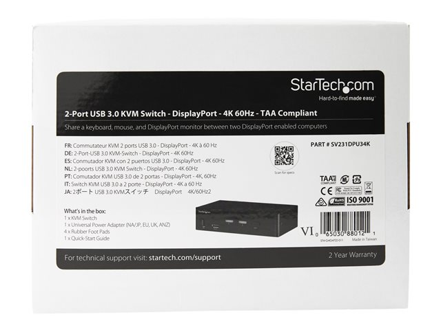 StarTech.com KVM switch écran clavier souris USB à 2 ports DisplayPort 4K 60 Hz - Commutateur KVM DP 1.2 avec hub USB 3.0 (SV231DPU34K) - Commutateur écran-clavier-souris/audio/USB - 2 x KVM / audio / USB - de bureau - Conformité TAA SV231DPU34K